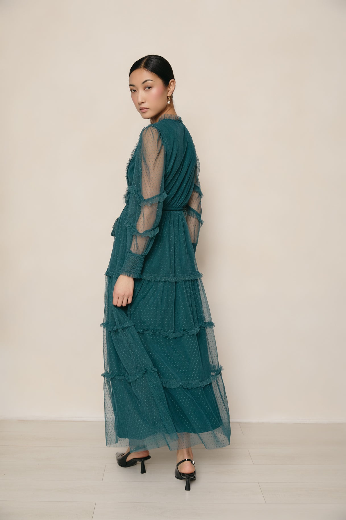 Made from soft mesh with a smooth poly knit lining, the Anastasia Dress features tiered layers that add shape and movement. The lace detailing highlights the silhouette, while the full sleeves and fitted waist create a flattering finish. The rich green tone makes it an elegant choice for daytime events or evening occasions.