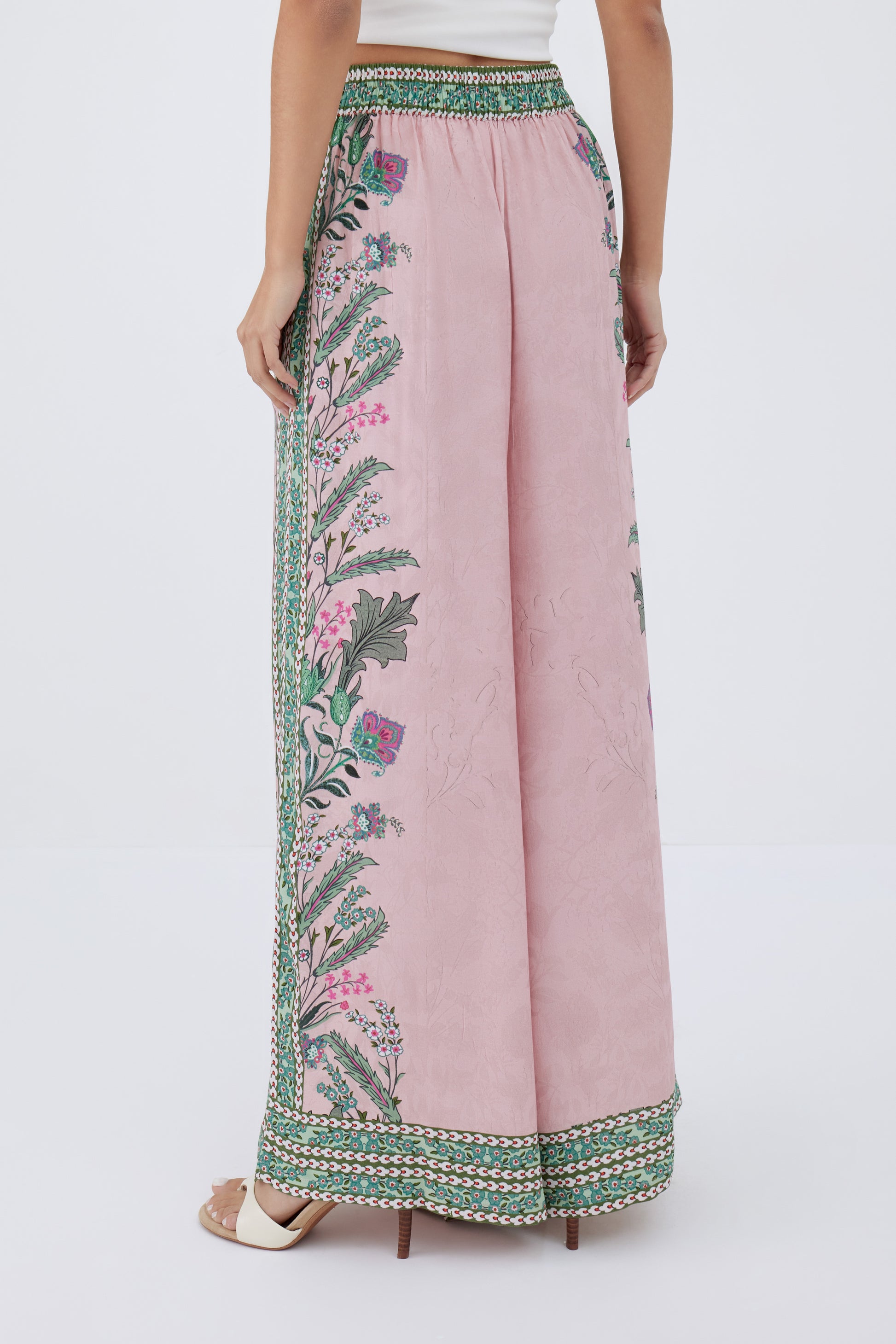 Wide-leg trousers crafted from lightweight fabric, adorned with detailed border prints for a refined touch. Designed with a high waist and a flowy silhouette, they provide both comfort and elegance. Wear them with the matching shirt for a bold ensemble or pair them with a simple top for a balanced look.