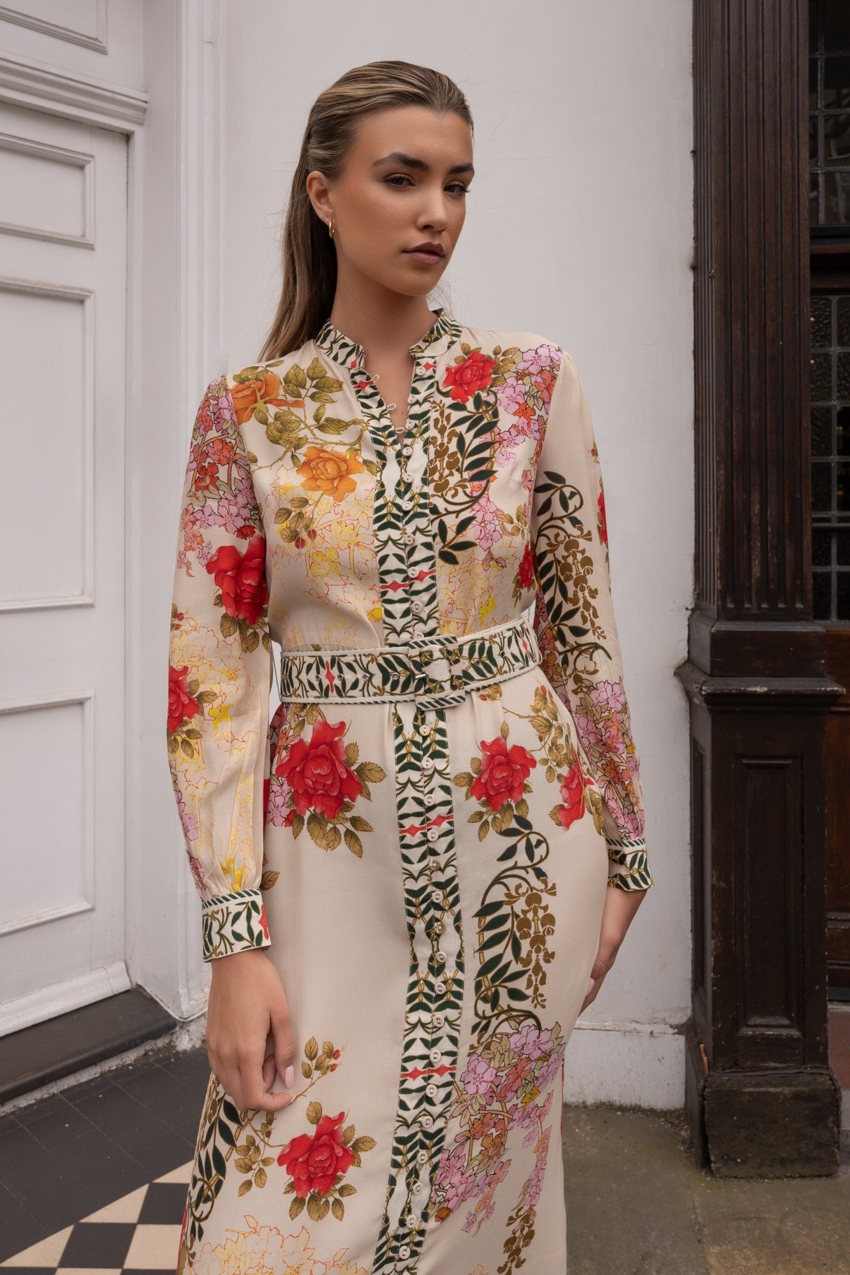Effortless style in our ivory floral midi dress. Designed with a flattering long-sleeve silhouette, button-down front, and a cinched waist with a reversible belt for a polished look. The soft viscose fabric drapes beautifully, while the vibrant floral print adds a fresh and feminine touch. Perfect for both casual outings and special occasions.