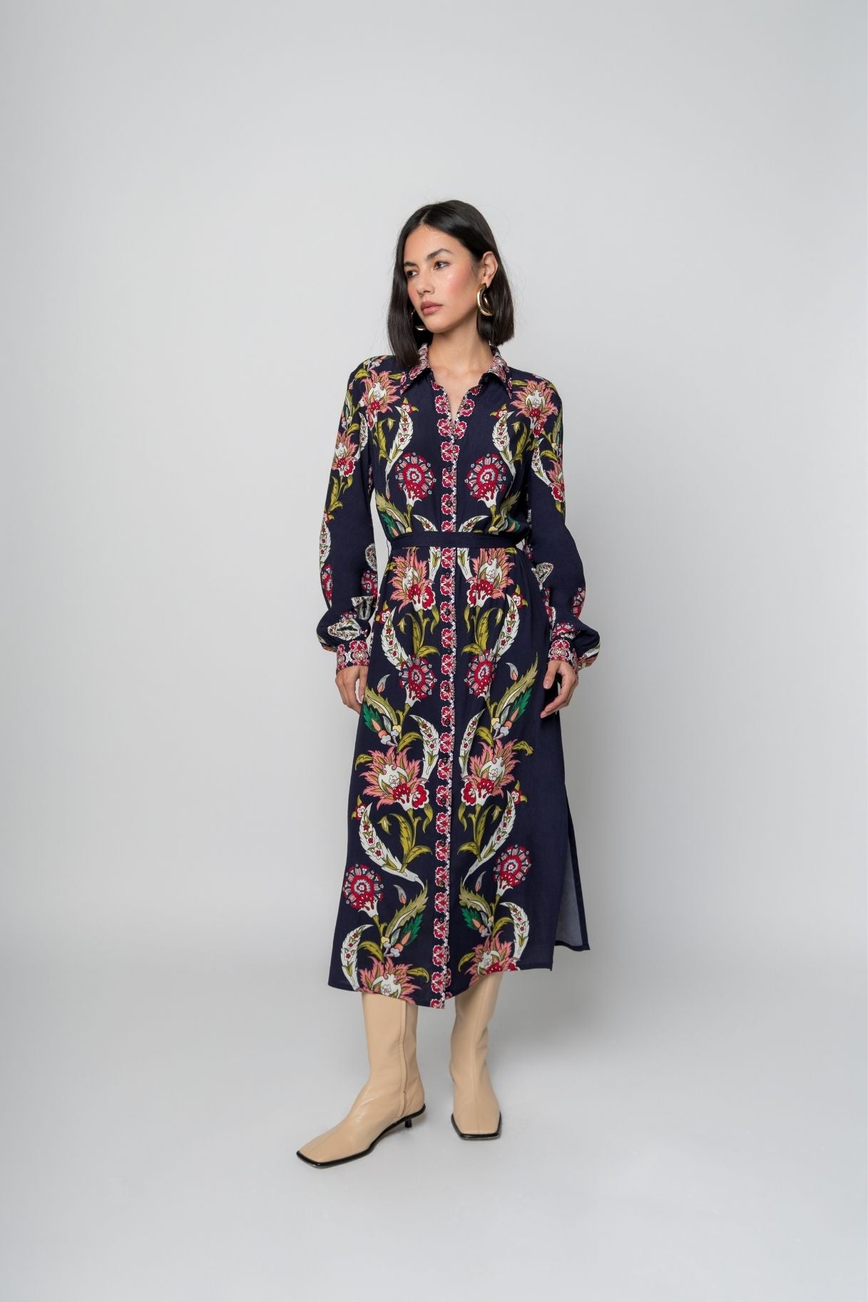 Remy dress is a full-sleeve, button-down midi shirt dress made from a soft dark fabric. It features a striking floral and paisley-inspired print in rich multicolours, arranged symmetrically along the front and sleeves. The dress has a structured collar, a belted waist that accentuates the silhouette, and elegant cuffed sleeves. The design combines traditional motifs with a modern cut, creating a bold yet sophisticated look.