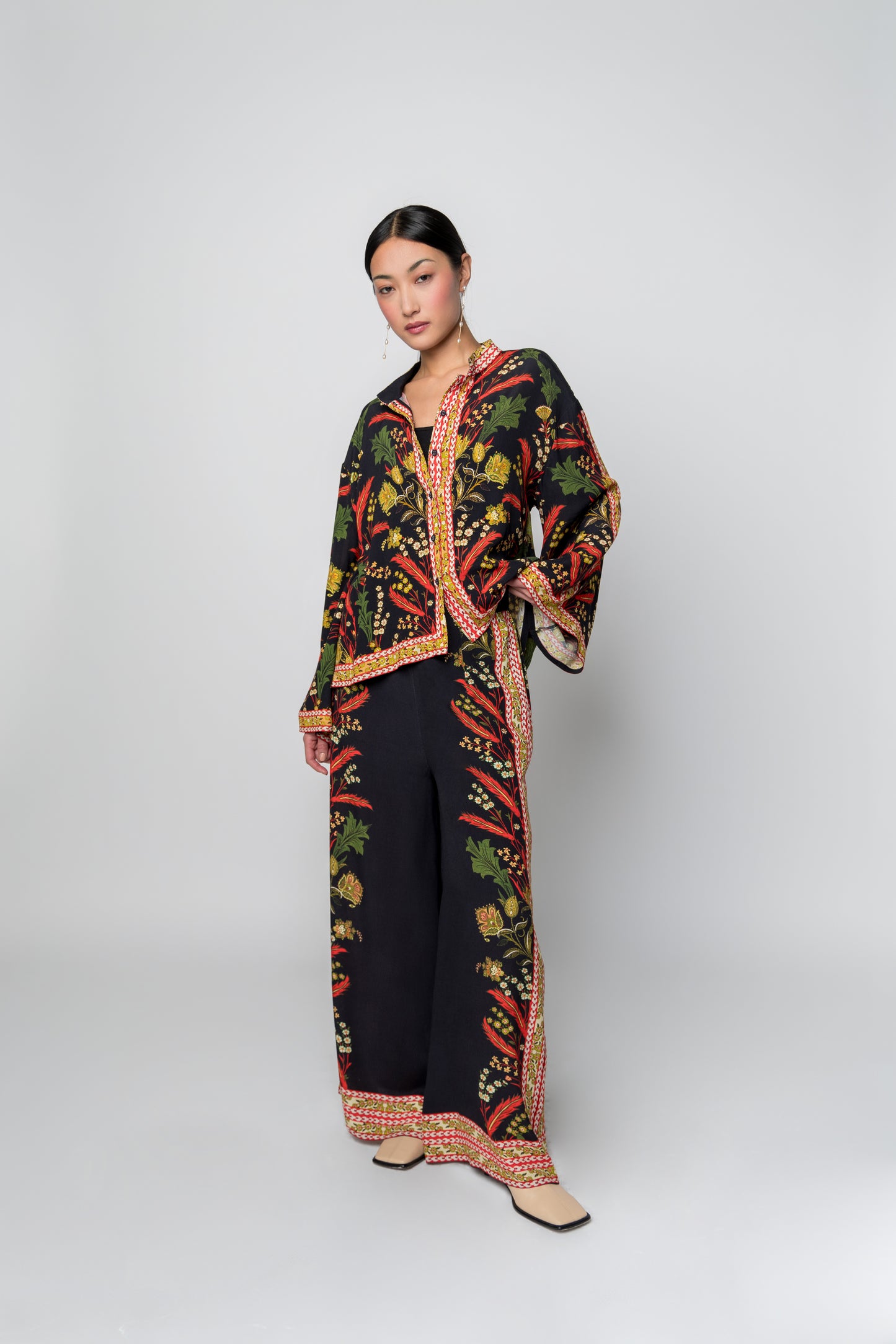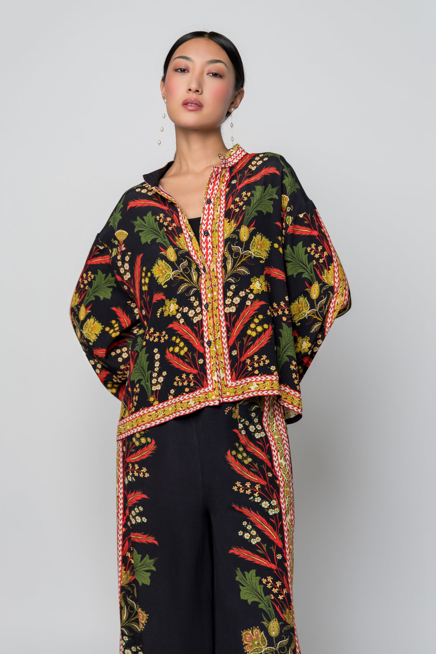 This black printed shirt features a bold botanical design with vibrant red, green, and yellow floral motifs. It has a relaxed, oversized silhouette with wide sleeves and a button-down front, framed by intricate red and gold border detailing. The high collar and cuffs are adorned with matching patterns, adding a touch of sophistication. Perfect for pairing with matching trousers or styling as a statement piece, this shirt blends comfort with elevated style for festive or resort wear.