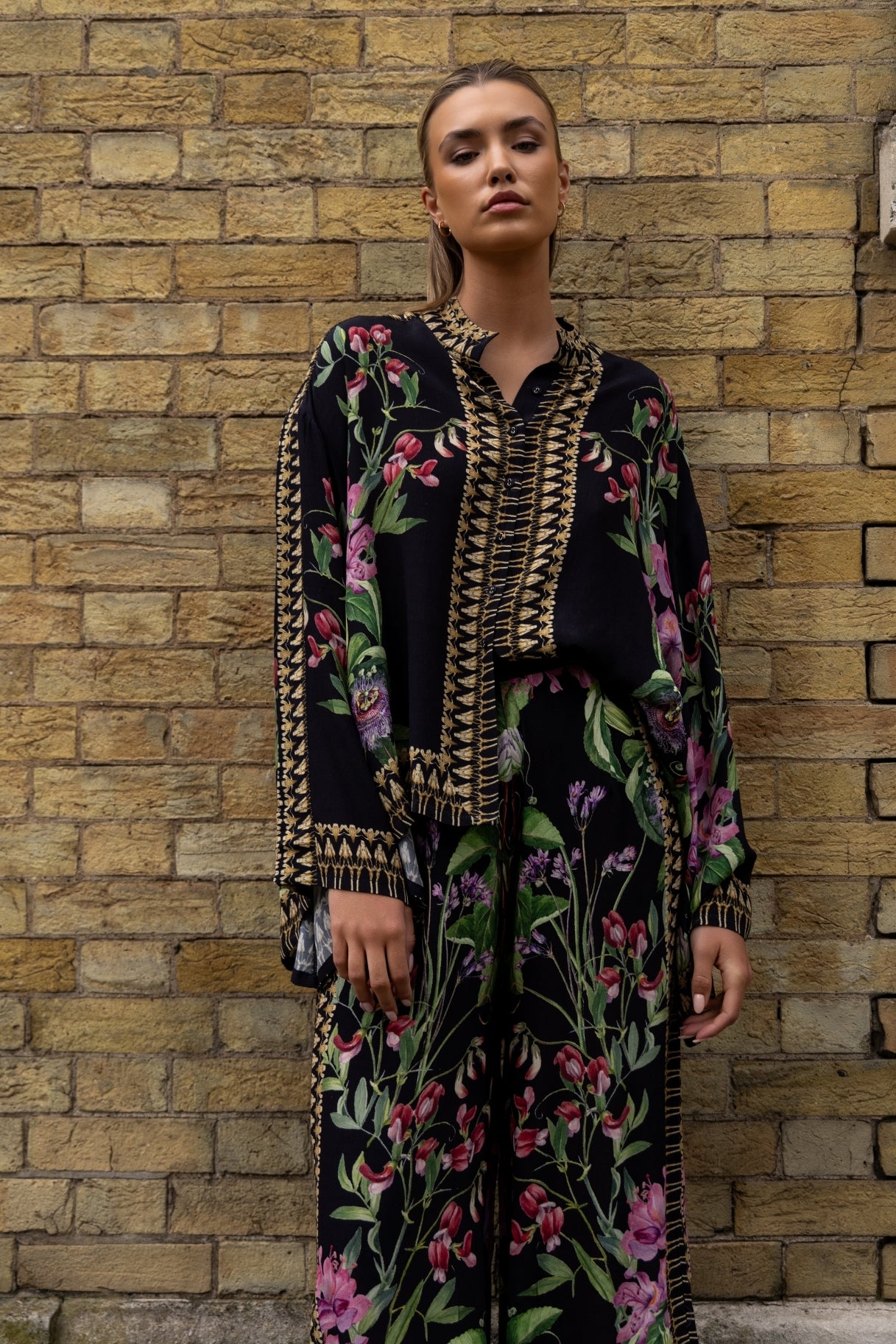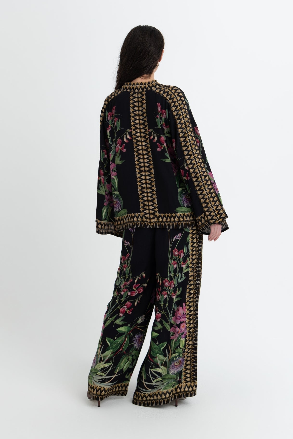 A relaxed-fit tunic-style shirt featuring intricate floral prints on a deep black base. Designed with wide sleeves and ornate border detailing, it blends comfort with effortless elegance. Pair it with matching trousers for a statement look or style it separately for versatile wear.
